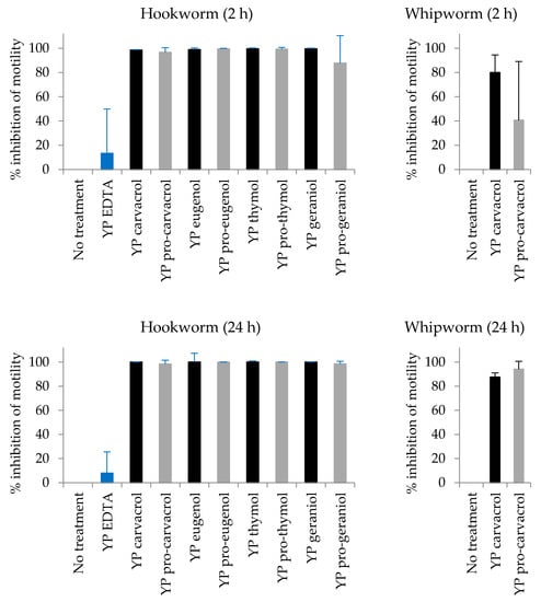 Inhibition of adult hookworm and whipworm motility by YP terpenes and YP pro-terpenes after 2 and 24 h incubation (results are average of eight worms per treatment). Percent inhibition of motility was calculated relative to the mean motility units of control worms (no treatment).