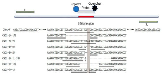 Schematic diagram of primer/probe design. Either deletions or insertions happened to the CAO1-edited rice (CAO1-1 ~ CAO1-7), the symbol “-” shows deleted bases and the shadow shows inserted bases. A universal primer pair (CAO1-F/R) is underlined by single line, the universal primers located upstream and downstream of edited region of CAO1 gene. The TaqMan probes are underlined by double line, eight probes are designed to target at the edited region of wild type DNA and edited type DNA, respectively.