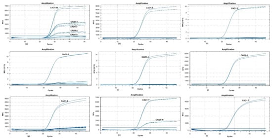 The primer set CAO1-F/R was sequentially combined with the wild type probe (CAO1-Pw) and seven edited type probes (CAO1-P1 ~ CAO1-P7) to perform real-time PCR for evaluating the specificity of each primer/probe combination, using the genomic DNA from wild type rice and CAO1-edited rice as templates. The amplification plots are shown in Figure 2. The primer/probe set of CAO1-F/R/Pw generated typical amplification curves from wild type DNA, and amplification curves with relatively weak signal were also observed from the edited type DNA of CAO1-2, CAO1-3, CAO1-4, and CAO1-7 (Figure 2a). Sequence alignment revealed only one or two base differences at the nucleotide level between wild type rice and the four edited rice plants (CAO1-2, CAO1-3, CAO1-4, and CAO1-7) (Figure 1), the minor differences in sequences resulted in unspecific amplification signal of the CAO1-F/R/Pw. The edited type sets of CAO1-F/R/P1, CAO1-F/R/P2, CAO1-F/R/P3, CAO1-F/R/P4, CAO1-F/R/P5, and CAO1-F/R/P6, all yielded expected amplification curves from corresponding edited type DNA (Figure 2b–g). Although the two sets of CAO1-F/R/P3 and CAO1-F/R/P6 produced weak and unspecific amplification signals, this would not affect the judgement of testing results because of the significant difference in signal intensity between specific and unspecific amplification (Figure 2d,g).