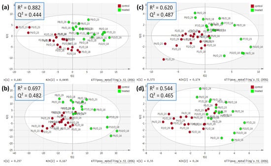 PLS-DA score plots after removing QC, D0, D3, D9 samples from the cleaned ESI− and ESI+ datasets acquired with RP UHPLC-HRMS. Datasets containing 1612 (ESI−) (a) and 2914 (ESI+) (b) features, n = 36. Reduced datasets containing 94 (ESI−) (c) and 46 (ESI+) (d) features, n = 36. Log 10 transformation, Pareto scaling and centering were applied.