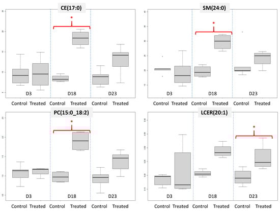 When looking at the differences of concentration between samples from control and treated animals at D3 for all measured lipids, only 1 HCER (HCER(24:1)) and 1 PE (PE(O-18:0_18:1)) were shown as significant (p-value ≤ 0.05), while 1 PC (PC(16:0_18:0)) and 1 TG (TG42:1-FA14:0) were marginally significantly affected (p-value ≤ 0.06). This correlates non-targeted results, where no significant patterns could be observed so early in the experiment. Interestingly, CE, CER, DCER, HCER, LCER, LPE and SM species appeared as significant in the discrimination almost exclusively at D18, while DAG exhibited a significant shift in lipid profiles mainly at D23. The significant shift of species from other classes was distributed evenly between D18 and D23. All the lipids were observed to be more concentrated in the serum of treated animals, except for 1 HCER measured in lower concentration in the serum of treated animals at D3 (HCER(24:1)). Globally, when the number of significant lipid species in either D3, D18, or D23 samples was proportionated to the number of analysed species per class, the most altered classes were CE, (85% of analysed species deemed as significant), SM, (42%), TAG (31%), LCER (30%), PC (29%) and HCER (27%). Examples of boxplots illustrating differences in concentration levels between samples from control and treated groups for four particular species are presented in Figure 2.