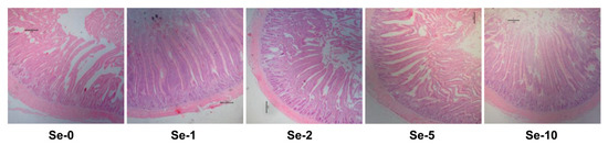 The live body weight and the weight index of the liver, heart, and spleen were not affected by dietary treatments (Table 8). As shown in Table 9, the weight index of the intestine including the duodenum, jejunum, ileum, and the total small intestine was not influenced by dietary treatments. The length index of duodenum showed significant (p ≤ 0.05) quadratic changes, decreasing first and then increasing along with the increase of dietary selenium supplementation, while those of the jejunum, ileum, and the total small intestine were not affected. The representative sections stained by HE for jejunum morphology are shown in Figure 1, and the quantitative results are listed in Table 9. The VH of the jejunum increased first and then decreased, thus showing a significant quadratic change (p ≤ 0.05). The CD of the jejunum of laying hens fed 1, 2, and 10 mg/kg of selenium was significantly smaller (p ≤ 0.05) than that of the control group, and those fed 2 mg/kg of selenium had the smallest CD (p ≤ 0.05). The laying hens fed 2 mg/kg of selenium showed a higher V/C of the jejunum than the other groups (p ≤ 0.05).