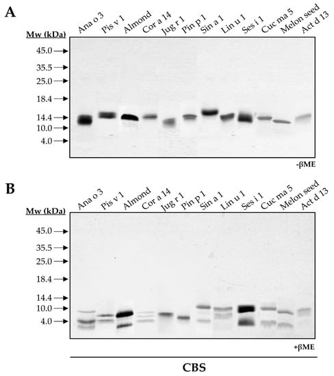 2S albumins are included in the low molecular mass proteins fraction (below 20 kDa) (Figure A1). Their abundance in seeds and nuts has been linked to an increased risk of allergic sensitization, as some of these proteins account for almost 30% of the total content [,]. 2S albumins belong to multigene families and undergo different proteolytic maturation, resulting in different isoforms, which contribute to their higher proportion relative to other seed proteins. Here, we demonstrated the presence of isoforms in Ana o 3, Cor a 14 and Cuc ma 5 proteins, as they split into more than two polypeptide chains with different length when treating them with reducing agents in both mono and 2D-electrophoresis.