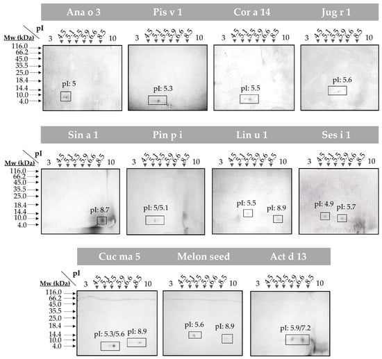 To evaluate the presence of isoforms in all the 2S albumins, 2D SDS-PAGE were assayed (Figure 2). Broad isoelectric points (pI) differences were detected in all proteins considering the great variability of their primary structures. Moreover, the polymorphic nature of these 2S albumins was elucidated (e.g., Ana o 3, Cor a 14 and Cuc ma 5) as indicated by the polypeptide chain isoforms (number of spots) that displayed similar molecular masses but different pI values.