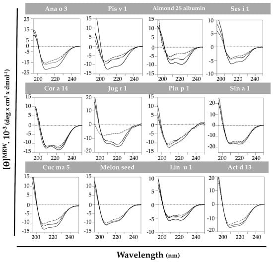 Pis v 1, Ana o 3, Ses i 1 and Lin u 1 do not completely loose the structure after the heat treatment but they do not recover their initial structures after cooling down. A possible aggregation of these proteins has been suggested at high temperatures, as reported for Ara h 2 [].