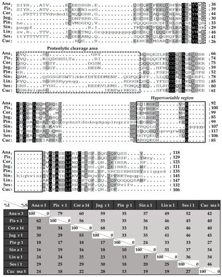 - Scala, E.; Villalta, D.; Meneguzzi, G.; Giani, M.; Asero, R. Storage molecules from tree nuts, seeds and legumes: Relationships and amino acid identity among homologue molecules. Eur. Ann. Allergy Clin. Immunol. 2018, 50, 148–155. [Google Scholar] [CrossRef] [PubMed]