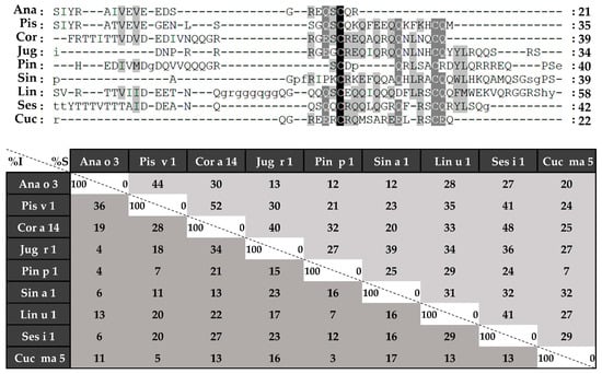 Foods represent one of the greatest antigenic loads the human immune system must face, tolerance being the normal physiological response. However, the prevalence of allergic reactions against foods has increased in recent decades, being estimated that 3–4% of the adult population and nearly 5% of children in Western countries suffer any kind of food allergy []. Among potential allergenic foods, a significant percentage corresponds to those from plant sources, highlighting the contribution of tree nuts, spices, seeds and fruits since hypersensitivity reactions against them begin at early ages and often persist throughout the life of individuals []. These foods are also known for their benefits to human health, providing a large quantity of beneficial compounds, some of them not available in animal origin food. Moreover, they are not only additional components in meals or snacks, but also oils are obtained from them for their use in food and cosmetic industries.