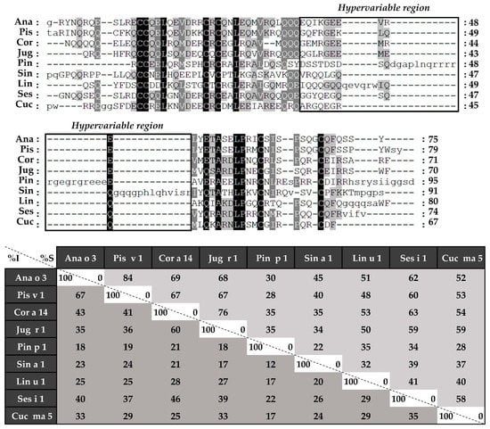 The hypervariable region, located in the most exposed area of these proteins, presents the lowest identity values and the most immunogenic epitopes that have been described in of some the 2S albumins [,] (Figure 7B). Due to its low sequence preservation, it has been believed that those epitopes are not involved in the cross-reactivity but polysensitization of atopic patients []. Only phylogenetically related allergens exhibit higher similarities in this area, as it is the case of Brassicaceae 2S albumins [,] or the Anacardiaceae members [].