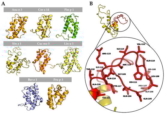 To better understand the possible structural similarities among 2S albumins, 3D structures of these proteins were studied (Figure 7A). 2S Albumins were characterized by a compact bundle of 4–5 α-helices with a C-terminal loop. The high similarity between the 3D structures of these proteins might indicate the presence of conserved structural epitopes between them [], even in poorly preserved amino acid sequences.