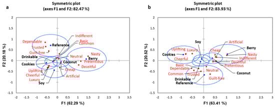 A correspondence analysis using a biplot for Western consumers (Figure 1a) indicated that 82.47% of the variability observed could be attributed to the first two principal components (F1: 62.29%, F2: 20.18%). The berry was more related to the negative terms (nasty, pretentious, deceitful), whereas the reference (guilt-free, trusted, dependable) and soy (luxury, uplifting, cheerful, artificial) were more related to positive emotions. The drinkable and cookies yogurts were related to more positive and neutral terms (‘common’, ‘basic’, ‘indifferent’, ‘luxury’, ‘cheerful’, ‘uplifting’) and coconut was associated with neutral and negative responses (‘cheap’, ‘neutral’). The biplot for Asian consumers (Figure 1b) similarly indicated that 85.5% of the variability observed could be attributed to the two principal components for (F1: 63.67%, F2: 21.49%). The berry and coconut yogurts were related to more negative emotion terms (‘nasty’, ‘artificial’, ‘cheap’, ‘deceitful’); the reference dairy yogurt was related to neutral emotions (‘guilt-free’, ‘common’, ‘neutral’) and the cookies yogurt was more associated with positive emotions (‘cheerful’, ‘luxury’, ‘uplifting’). The drinkable and soy yogurts were very similar to each other.
