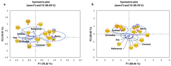 The correspondence analysis biplot for Western consumers (Figure 2a) indicates that 86.93% of the variability observed could be attributed to the first two principal components (F1: 76.42%, F2: 10.51%). Meanwhile, a biplot for Asian consumers (Figure 2b) found that 89.76% variability (F1: 68.94%, F2: 20.83%) could be attributed to these components. Both yogurt products, coconut and berry, were related to more negative emojis by Asian as well as Western consumers, and the cookies was placed in the positive region by both cultural groups. In the case of Western participants, the reference, drinkable and soy yogurts were placed in between the positive and negative emotional areas, whereas Asian participants related the drinkable with positive emojis, and the reference and soy were placed in between the positive and negative regions.
