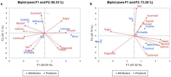 Biplots for facial expression recognition analysis comparing for the two cultural groups: (a) Western consumers, (b) Asian consumers.