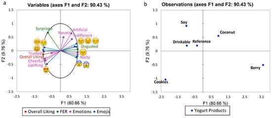 Multifactor analysis for a combination of check-all-that-apply (CATA) emotions, check-all-that-apply (CATA) emojis and facial expression recognition (FER) with overall liking ((a)-variables, (b)-yogurt products).