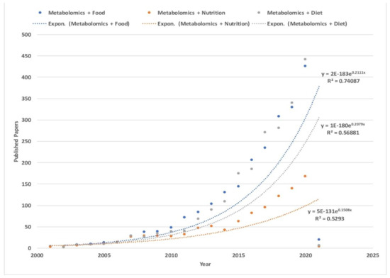 Number of published papers over the years. Each line represents search results conducted (13 January 2021) on Web of Science (www.webofknowledge.com, accessed on 13 January 2021) for: (blue) topic: (metabolomics) and topic: (food), (orange) topic: (metabolomics) and topic: (nutrition), and (gray) for topic: (metabolomics) and topic: (diet). Timespan: all years. Indexes: SCI-EXPANDED, SSCI, A&HCI, CPCI-S, CPCI-SSH, ESCI, CCR-EXPANDED, IC. The higher results of the search topics among metabolomic papers were for “metabolomics with food” with 2253 papers, followed by the topic “metabolomics with diet” with 2168 papers, and finally “metabolomics with nutrition” with 995 papers. Moreover, the topic “metabolomics with food” has shown an exponential increase over the years with R2 = 7, higher than both “metabolomics with diet and nutrition” with an exponential trend of R2 = 5, pointing to a positive exponential growth of interest among scientists towards the exploration of food metabolomics. Further information about the published papers in the three topics is in the Supplementary Materials (Figure S1).