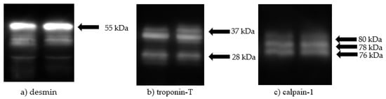 - Koohmaraie, M.; Kennick, W.H.; Elgasim, E.A.; Angelmier, A.F. Effects of Postmortem Storage on Muscle Protein Degradation: Analysis by SDS-Polyacrylamide Gel Electrophoresis. J. Food Sci. 1984, 49, 292–293. [Google Scholar] [CrossRef]
