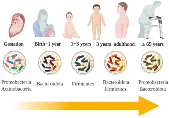Approximately 106–1014 microorganisms belonging to the domains eukaryotic, archaea, and bacteria colonize the human gastrointestinal tract. Gut microbiota is composed of approximately 1000 species, and the main phyla are Firmicutes and Bacteroidota, and, to a lesser extent, Fusobacteria, Cyanobacteria, Proteobacteria, Verrumicrobia, and Actinobacteria can also be found []. However, this composition undergoes changes over time (Figure 1) and the dominant bacterial phyla are different at each stage of human life [].