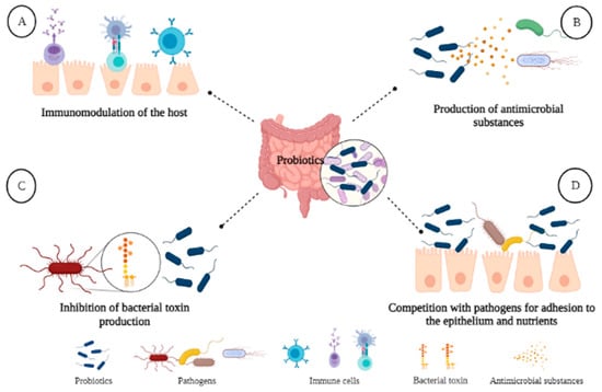 Various genetic and molecular studies have made it possible to determine that probiotics exert beneficial effects through four main mechanisms (Figure 4): (1) the immunomodulation they exert in the host; (2) antagonism through the production of antimicrobial substances; (3) the inhibition of bacterial toxins; and (4) competition with pathogens by adhesion to the epithelium and by nutrients [,]. These mechanisms are relevant in the prophylaxis, treatment of infections, and maintenance of the host’s intestinal microbiota [].