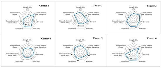 Hoek et al. [,] and Schösler et al. [] showed that the consumption of meat substitutes is related to consumers’ familiarity with these products. Interestingly, heavy users of meat substitutes do not necessarily demand substitutes that have a similar appearance to real meat products (e.g., sausages or mince). By contrast, consumers who do not consume meat substitutes as often or regularly tend to want them to look similar to real meat. Accordingly, Hoek et al. [] also revealed that if meat substitutes have a resemblance to real meat, they have an advantage in the market. This does not necessarily translate to an appearance similar to that of a meat product. The resemblance can also refer to a similar use in meals. Thus, it can be inferred that Cluster 2 (comprising uncompromising meat-eaters) is more likely to consider meat alternatives that are similar to meat in, for example, appearance and uses in meals. Further, it is likely that the subjects in Cluster 6, who are more familiar with meat alternatives than those in Cluster 2, are more likely to consider meat alternatives that are dissimilar to meat.