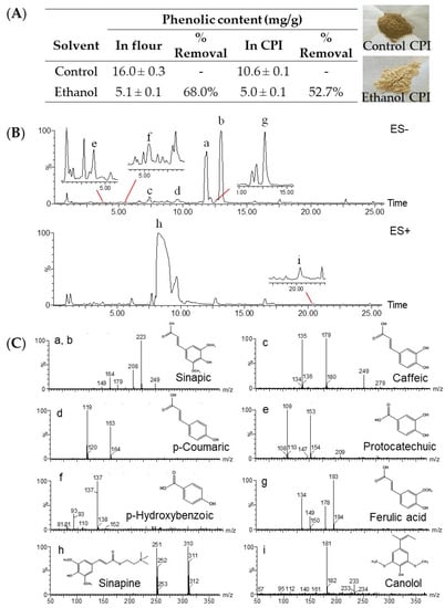 Total phenolic content (mg/g) in canola seed flour and protein isolate (CPI) dephenoled with 70% ethanol (A); representative UPLC−TOF−MS chromatogram (B); structure (C); of phenolic compounds (a–i) extracted from canola flour.