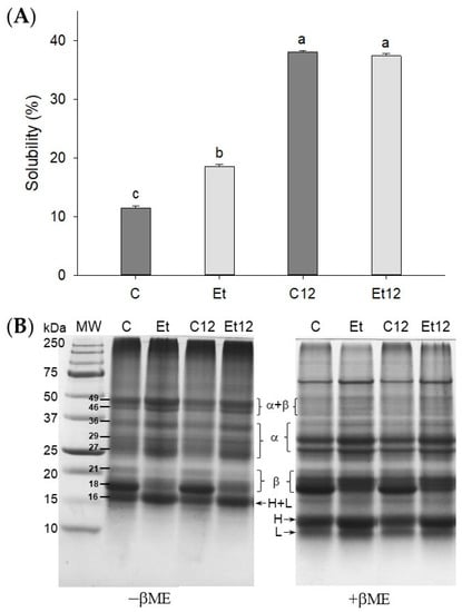 Protein solubility (A) and SDS–PAGE (B) of dephenoled CPI without or with pH12 shift treatment. Samples C: control; Et: dephenoled with 70% ethanol; C12 and Et12: pH12 shift treated samples. Bar values with different letters (a–c) are significantly different (p < 0.05). βME: β-mercaptoethanol; MW: molecular weight standard; α, β, H, and L: subunits of CPI.