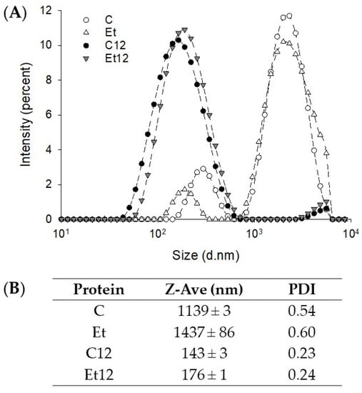 The intensity-diameter distribution (A) and Z-average diameter (B) of dephenoled canola protein isolate with or without pH12 shift treatment. PDI: particle dispersion index. Samples: C: control; Et: dephenoled with 70% ethanol; C12, and Et12: pH12 shift-treated samples.