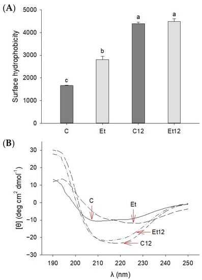 Surface hydrophobicity (A) and circular dichroism (B) of dephenoled canola protein isolate with or without pH12 shift treatment. Samples: C: control; Et: dephenoled with 70% ethanol; C12 and Et12: pH12 shift-treated samples. Bar values with different letters (a–c) are significantly different (p < 0.05).