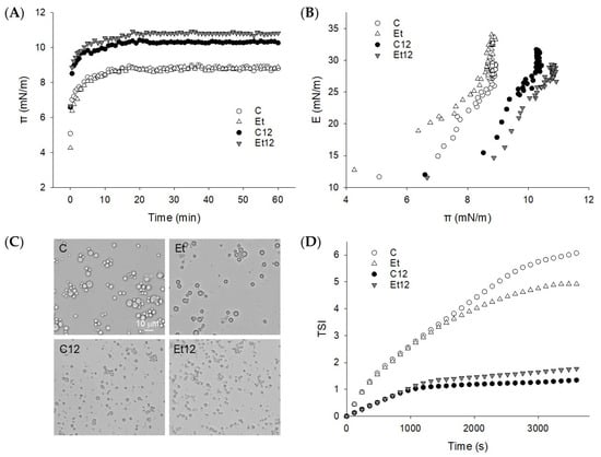 Dynamic surface pressure π-t curve (A) and surface dilatational modulus E-π curve (B) of proteins adsorbed at the oil–water interface. (C): light microscopy of fresh emulsions; (D): Turbiscan stable index (TSI) of the emulsions. Samples: C: control; Et: dephenoled with 70% ethanol; C12 and Et12: pH12 shift-treated samples.