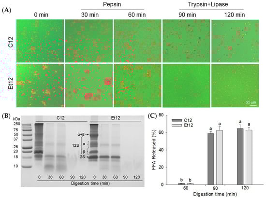 Confocal laser scanning microscopic images (A), SDS–PAGE of supernatant proteins (B), and percentage of free fatty acids (FFA) released (C) for in vitro digested emulsions. The emulsions were prepared with the pH12 shift-treated control CPI (C12) or ethanol dephenoled CPI (Et12). α, β, 2S, and 11S denote canola protein subunits. Means with different letters (a,b) differ significantly (p < 0.05).