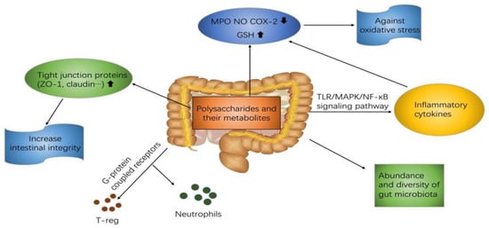 The excretion of inflammatory cytokines is regulated by the inflammatory signaling pathways including toll-like receptors (TLR), mitogen-activated protein kinase (MAPK), nuclear factor-κB (NF-κB), and G-protein coupled receptors, which participate in regulating the phosphorylation level of TLR2/4/6, ERK, IκB, GPR41, and GPR43 []. By regulating these signal transduction pathways, natural polysaccharides and their metabolites ameliorate IBD symptoms in the damaged tissues. Polysaccharides alleviate oxidative stress through down-regulating the production level of oxygen free radicals including myeloperoxidase (MPO), nitric oxide (NO), malondialdehyde (MDA), which subsequently facilitate IBD symptoms [].