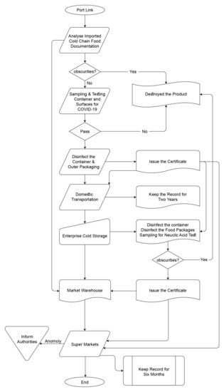 Zenia et al. have analyzed COVID-19’s impact on the food industry concerning food safety recommendations from various governmental and public organizations [2], and is a basic document from the existing literature in our use case. It is reassuring to state that, despite the worldwide spread of COVID-19, there is no evidence of transmission of this infection via consumption [24,25,26]. Therefore, as stated by public health agencies worldwide, there is no evidence that food poses a risk to public health concerning COVID-19. The main transmission of COVID-19 is through respiratory droplets from the infected [25]. These droplets may quickly fall on the floor and surfaces. The United States Centers for Disease Control and Prevention provided the latest information on COVID-19. The COVID-19 virus survived on cardboard and hard surfaces for up to 72 h in an experimental setting. Thus, it is more likely that the infected food worker will spread the virus from person to person, or through droplets on the surface of the food-processing plant and food packaging [26]. COVID-19 is an issue of occupational safety, and it is necessary to ensure that the workers are healthy and do not contaminate the food through infected droplets on surfaces, food, and packaging [27]. The companies need to implement strict measures for employee health-screening, daily disinfection of surfaces and surroundings, proper use of personal protection equipment by the workers, and effective laundry monitoring. Training and effective communication with the workers are equally important. According to the requirements of the state council’s China “Work Plan for Prevention and Comprehensive Disinfection of Imported Cold Chain Food”, the General Administration of Customs, Ministry of Transportation, Health Commission, and General Administration of Market Supervision are monitoring bodies for the implementation of this plan throughout China citation added [11]. The import process workflow is described with the help of the flow chart in Figure 4.