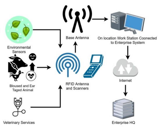 The system architecture of our farm management system is shown in Figure 7. Digital data about the feeding and animal breed age and health are digitally available to feed to the blockchain. The processing plant monitors and records every employee’s health, with identification twice a day at the start and end of the shift, and uploads it to the blockchain with a specially designed smart contract. The thermal cameras at the entry–exit and different locations of the plant also continuously monitor the employees’ health. The plants are strictly applying the food safety recommendations. The plant’s livefeed is available to the importers, so they can oversee the plant’s safety conditions. The food packages are carefully packed and completely disinfected with the recommended chemicals, including the container. The enterprise is also responsible for another disinfection at the port, before closing the container and updating the certificate from port authorities on the system. The whole production batch will be returned or destroyed if an anomaly is found in the health of the employees who worked on that specific batch. The flow chart in Figure 4 explainins the domestic operations. All the data will be uploaded on the food safety blockchain system designed for the Hubei Food Safety Authorities.