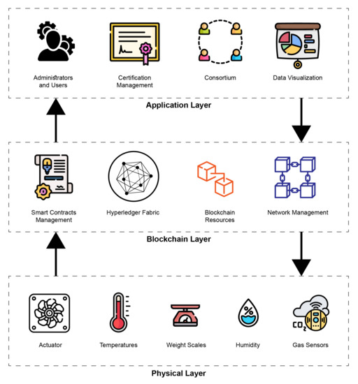 The application layer consists of Administrators and Users, Certification Management, Consortium Formation, and Data Visualization. Hyperledger Fabric is a consortium-oriented blockchain platform. The consortium consists of relevant departments and enterprises. According to the government policy, the consortium creates policies to conduct its operations and update its smart contracts, to carry out all the operations.