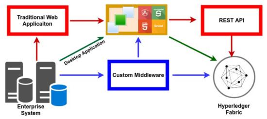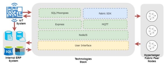 We developed a technological stack to integrate the existing enterprise architecture with a behind-the-scenes blockhain network. Figure 10 refers to our technology stack to develop blockchain-based applications. The technology stack consists of Structured Query Language (SQL), Moongoes, Fabric Software Development Kit (Fabric SDK), Express and Message Queuing Telemetry Transport Broker (MQTT Broker), on top of a NodeJS platform. It provides the functionality required to integrate the blockchain network with the existing enterprise network to load data to/from the blockchain network. The Hyperledger Fabric provides a flexible architecture and Representational State Transfer Application Programmin Interface (REST API) to develop the user interface to interact with the blockchain (Figure 11). The front end of the application can be developed as a traditional web application. A desktop application or a custom middle care can be created using the application development kits provided by Hyperledger Fabric.