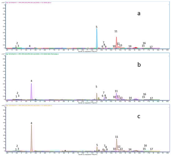 DMRM chromatograms of (a) grape juice, (b) must, (c) wine.