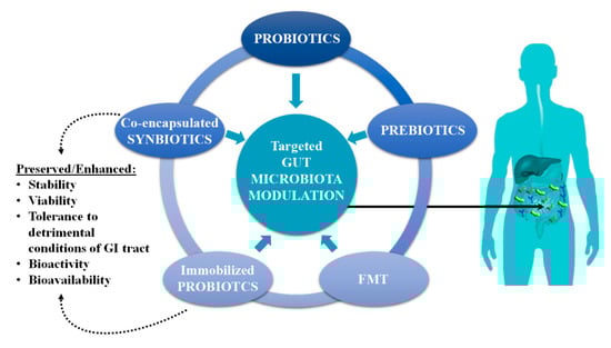 This review focuses on modern approaches that are currently being developed to modulate the gut microbiota, with an emphasis on the health benefits mediated by co-encapsulated synbiotics and immobilized probiotics (Figure 1). The impact of processing, storage, and simulated gastrointestinal conditions (sGIC) on the viability and bioactivity of probiotics, with or without prebiotics such as omega-3 polyunsaturated fatty acids (PUFAs), phytochemicals, and dietary fibers, using various delivery systems are considered.