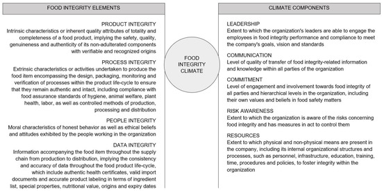 These human or climate components remain unstudied in the domain of food integrity. As it is assumed that the five climate components are also relevant in the context of food integrity, they were integrated with the four food integrity elements (product, process, people, and data integrity) distinguished by Manning (2016) [8], defined in Figure 2, for the elaboration of the food integrity climate definition.