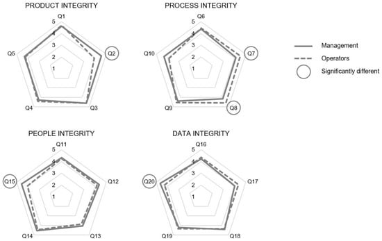 A more detailed analysis at each single indicator level revealed statistical differences between management and operators in five indicators (Q2, Q7, Q8, Q15, and Q20), as shown in Table A1 in Appendix B and represented in Figure 3. Managers scored higher than operators in Q2, Q15, and Q20, where two of these indicators (Q15 and Q20) are related to the climate component resources regarding respectively people and data integrity, while Q2 concerns the component communication in relation to product integrity. Operators perceived the climate components communication (Q7) and commitment (Q8) regarding the process integrity better than managers.
