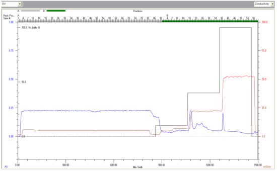 The unbound deer whey protein fraction (20 mL) obtained from the first chromatography FPLC step was adjusted to pH 7.0 and applied to a HiTrap SP-FF 5 × 5 mL cartridge equilibrated in 20 mM sodium dihydrogen phosphate at pH 7.0, at a flow rate of 5 mL/min. The Lf protein was eluted with 20 mM sodium dihydrogen phosphate, pH 7.0, containing 1 M NaCl.