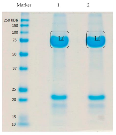 Sodium dodecyl sulfate-polyacrylamide acrylamide gel electrophoresis (SDS-PAGE) of lactoferrin (Lf) obtained by cation exchange chromatography from deer milk. Both lanes 1 and 2 are Lf isolated from deer milk.