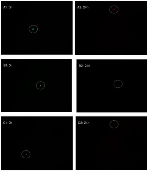 The effects of deer Lfcin at 240 µg/mL, bovine Lfcin at 120 µg/mL, and bovine Lfampin at 480 µg/mL on E. coli ATCC 25922 viability at 0 and 24 h in the antimicrobial activity tests are shown in Figure 4. Green colored bacterial cells indicate an intact bacterial membrane, which at 0 h indicate that the bacteria were viable. After 24 h of exposure to antimicrobial peptide, the E. coli cells exhibited a red color. This indicated that E. coli ATCC 25922 bacteria were non-viable following exposure to the antimicrobial peptides. The antibiotics penicillin (10,000 units/mL) and streptomycin (10,000 µg/mL) were used as controls. Figure 4D shows the E. coli cell viability at 0 and 24 h in the presence of antibiotics. It can be concluded that these three peptides at their MICs had an equivalent inhibitory effect on E. coli ATCC 25922 as did the antibiotics.