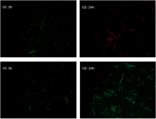 Bacterial viability determined using the LIVE/DEAD BacLightTM Bacterial viability kit. Incubation with lactoferricin (Lfcin) and lactoferrampin (Lfampin) at 0 and 24 h. (A) E. coli ATCC 25922 incubated with deer Lfcin 240 µg/mL. (B) E. coli ATCC 25922 incubated with bovine Lfcin 120 µg/mL. (C) E. coli ATCC 25922 incubated with bovine Lfampin 480 µg/mL. (D) E. coli ATCC 25922 incubated with penicillin (10,000 units/mL) and streptomycin (10,000 µg/mL). (E) E. coli ATCC 25922 incubated with nutrient broth. (F) L. acidophilus ATCC4356 incubated with deer Lfcin 480 µg/mL. (G) L. acidophilus ATCC4356 incubated with penicillin (10,000 units/mL) and streptomycin (10,000 µg/mL). (H) L. acidophilus ATCC4356 incubated with MRSc broth. Green fluorescence indicates viable bacteria, red fluorescence indicates non-viable bacteria. Microscope magnification ×1000.