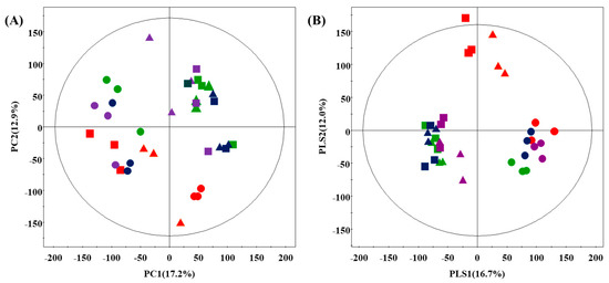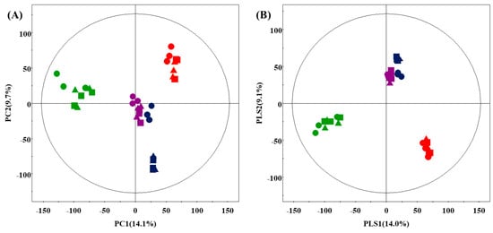 Principal component analysis (PCA) (A) and partial least squares discriminative analysis (PLS-DA) (B) score plot of the primary metabolome of doenjang with different herbs derived from GC-TOF-MS. Red, D_CN; green, D_CR; blue, D_KM; purple, D_PM; ●, day 1; ▲, day 30; ■, day 150.