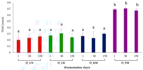 Comparison of the antioxidant activity (DPPH) of doenjang with different herbs. Red, D_CN; green, D_CR; blue, D_KM; purple, D_PM. Different letters in the bar graph indicate the significant differences obtained by Duncan’s multiple range test (p-value < 0.05).