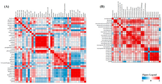 Correlation map between the metabolites (primary (A) and secondary (B)) and antioxidant activity.