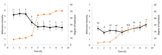 Evolution of bitterness and DH during hydrolysis kinetics 109 (a) and 125 (b). The black kinetics 109 (■) and kinetics 125 (▲), respectively. The dotted orange lines represent the evolution of DH for kinetics 109 (■) and kinetics 125 (▲), respectively. The bitterness intensity values from 1 (low) to 7 (high) are means +/− standard deviation (n = 2): the different letters (a, b, c) indicate means that significantly differ among the nine samples at p ≤ 0.05 according to Duncan’s multiple range test.