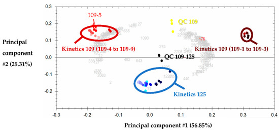 PCA was performed using the 116 identified peptides (shown as light grey numbers in Figure 2) whose amino acid sequences are gathered in Supplemental Data S1. Figure 2 shows the first two principal components and illustrates the correlations between the 36 withdrawn samples. These principal components #1 and #2 explain 82.16% of the variance, and in such PCA, the more distant the groups, the more different in terms of peptide population. In the biplot presented in Figure 2, the technical replicates (same colour points) of each sample (including QCs) are close to each other, as can be seen with the examples shown with a red arrow on the PCA, indicating good technical repeatability. Moreover, the QCs of kinetics 109 (in yellow) are found at almost equal distance between the two groups formed by kinetics 109, and it is the same for those of kinetics 125 (in dark to light blue) and the QC of kinetics 109–125, which are found between the three groups represented on the PCA.