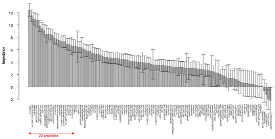 RT and RF were also performed by merging the samples of kinetics 109 and 125. The importance of peptides as predictors of the main taste characteristic of enzymatic hydrolysates, namely bitterness, is presented in Figure 5. The measure of this importance quantifies the contribution of each peptide to the prediction of the sensory profile. Based on the confidence interval, we noticed that more than three quarters (94) of the peptides influenced bitterness. In order to build an accurate and parsimonious model and to identify the best subset of predictors from the 94 pre-selected predictor variables, we reduced the number of predictors by adding the peptides sequentially, from the most important to the least important one: all possible subsets from 5 to k variables are considered in turn. For each subset, an RF is constructed with the same parameters as before. The quality of the prediction was computed for each model generated and evaluated using the RMSEOOB index. The lower it is, the better the quality of the prediction will be. The optimal RF was obtained for 22 peptides with a RMSEOOB of 0.3405. The latter therefore corresponds to the first 22 peptides presented in Figure 5.