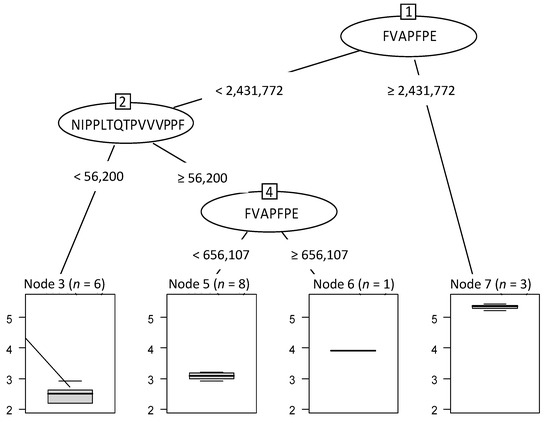 Thanks to the 22 peptides, an optimal RT has been built (Figure 7). The first peptide which splits the initial 18 samples into 2 groups was FVAPFPE at a normalised abundance threshold value of 2,431,772. The three samples (node 7, n = 3) with a value higher than this threshold were considered as the most bitter. These latter are the three first samples of kinetics 109 (109-1, 109-2 and 109-3). On the other hand, fifteen hydrolysates with a FVAPFPE value below this threshold were grouped together (nodes 3, 5 and 6 with, respectively, 6, 8 and 1 sample(s)). Then, when the normalised abundance of NIPPLTQTPVVVPPF was lower than 56,200.67, six samples were separated from the others and revealed the least bitterness perception. A last split was performed another time with the peptide FVAPFPE and beyond the abundance of 656,107.8. The hydrolysate was again considered more bitter when the peptide abundance was higher than this value.