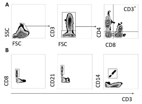 Gating strategy applied to flow cytometry data. (A) Viable cells were selected based on FSC and SSC, followed by establishing a gate of CD3+ and CD3− gates. Further gates based on CD4 and CD8 markers were established within CD3+ gate. (B) Gates based on CD3 and CD8, CD21, CD14 markers were established within viable cell gate.