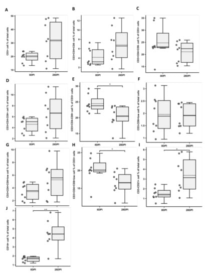 Immunophenotyping of cells obtained from pigs before (0DPI) and 28 days after (28DPI) supplementary feeding by flow cytometry. Box plots show the percentage (mean ± SD) of CD3+ cells (A), T helper cell (CD3+CD4+CD8−) proportion of total (B) and CD3+ (C) cells, T cytotoxic cell (CD3+CD4−CD8+) proportion of total (D) and CD3+ (E) cells, percentage of NK cells (CD3−CD4−CD8+low) (F), T memory cell (CD3+CD4+CD8+low) proportion of total (G) and CD3+ (H) cells, percentage of B cells (CD3−CD21+) (I), and percentage of macrophage/monocyte cells (CD14+) (J). Asterisks indicate statistical significance between groups based on two-tailed Wilcoxon rank sum test results (* p < 0.05; ** p < 0.005).